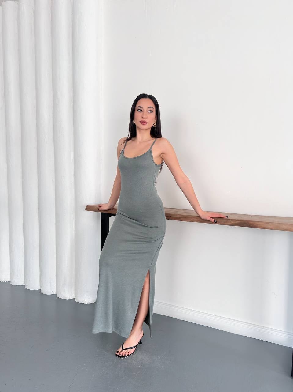 Kadın İp Askılı Yırtmaçlı Basic Maxi Elbise - Yeşil